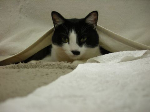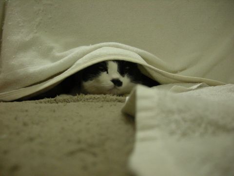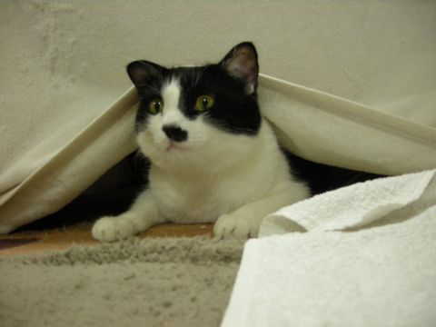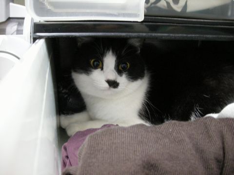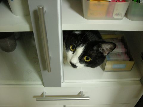 自分の新しい隠れ場所と言わんばかりに状況を確かめています。