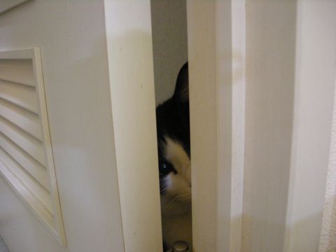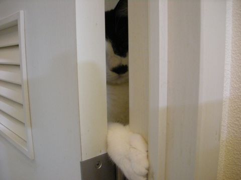ドアの隙間から何かがこちらを見つめています・・・。 何でそんなところに隠れているのかなぁ(笑) しかもドアと壁、本当に狭いところに。 うわっ! 手が出てきたー。 ・・・手を動かす勢いでドアに挟まれないか心配です。